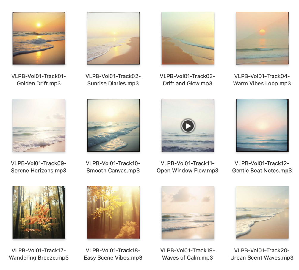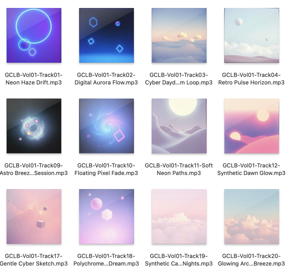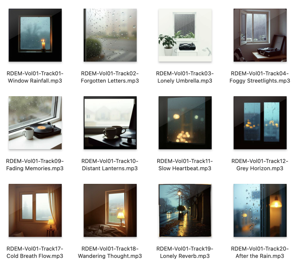 - Matching JPG cover art for each track (great for thumbnails, playlist covers, product previews)