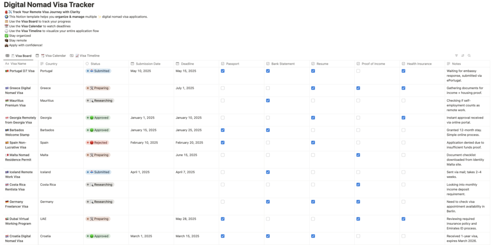 Stay organized while applying for multiple remote work visas — in one smart Notion template.