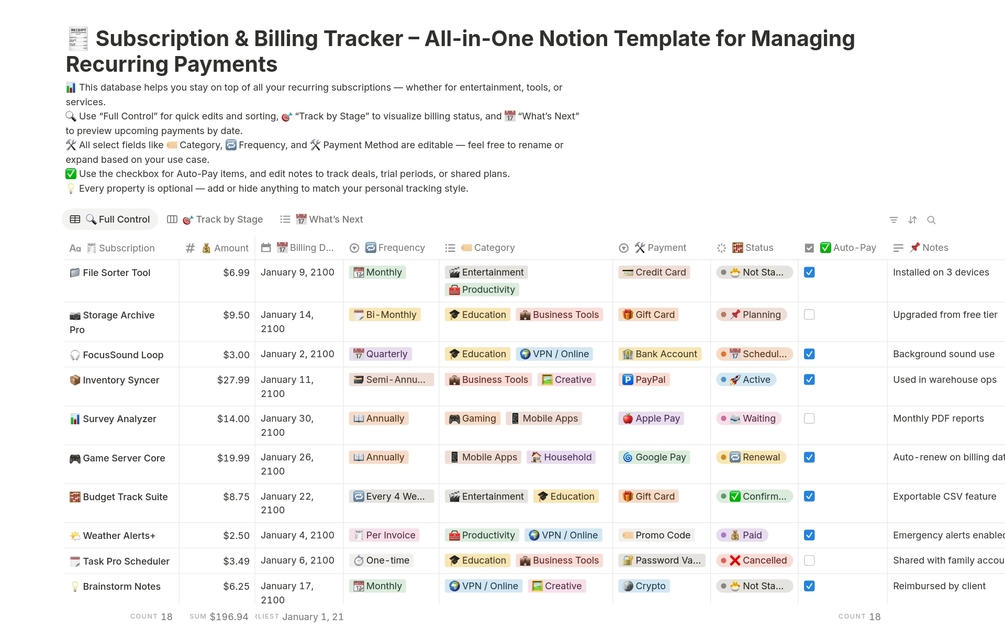 🧾 Subscription & Billing Tracker – All-in-One Notion Template for Managing Recurring Payments
