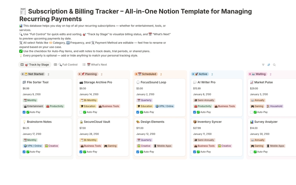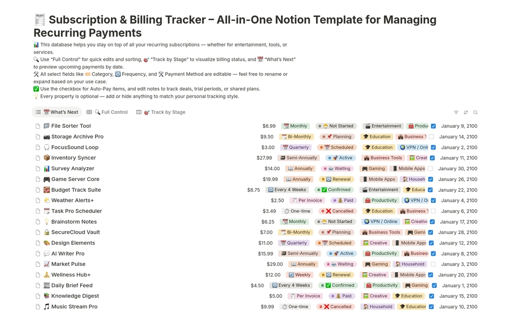 🧾 Subscription & Billing Tracker – All-in-One Notion Template for Managing Recurring Payments