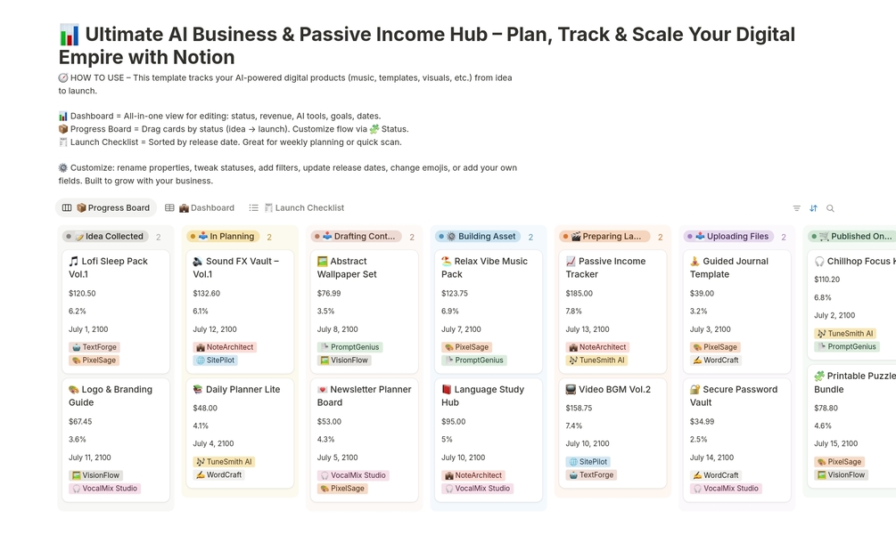 The AI Business & Passive Income Hub is a clean, powerful Notion template for creators who sell templates, music, visuals, or any digital asset online — and want one place to manage it all.