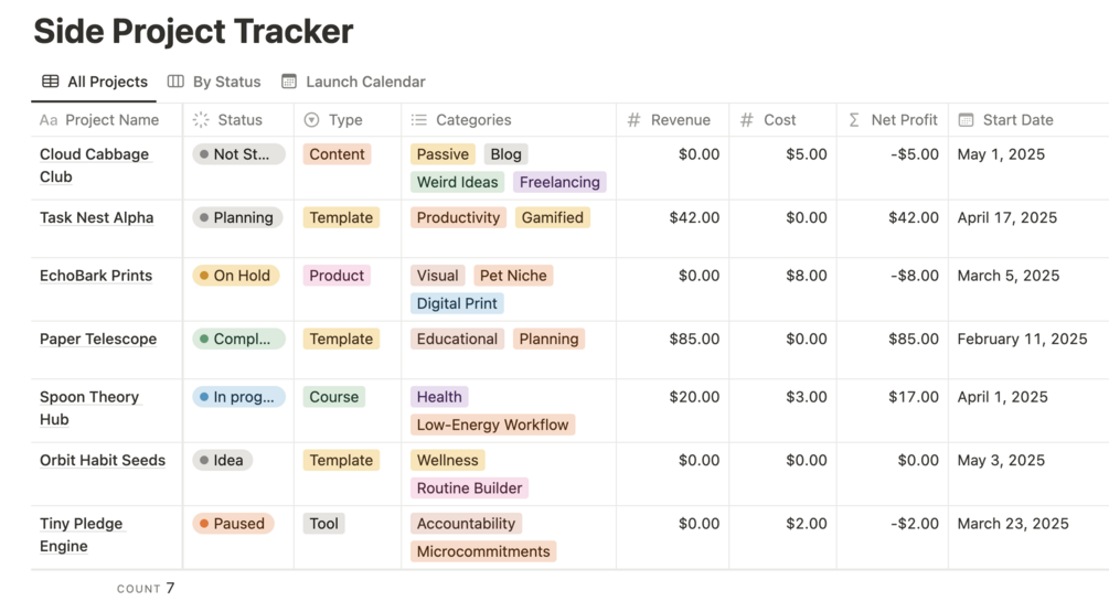 Stay on top of every side project with this clean Notion tracker — plan launches, track profits, and manage ideas all in one place.