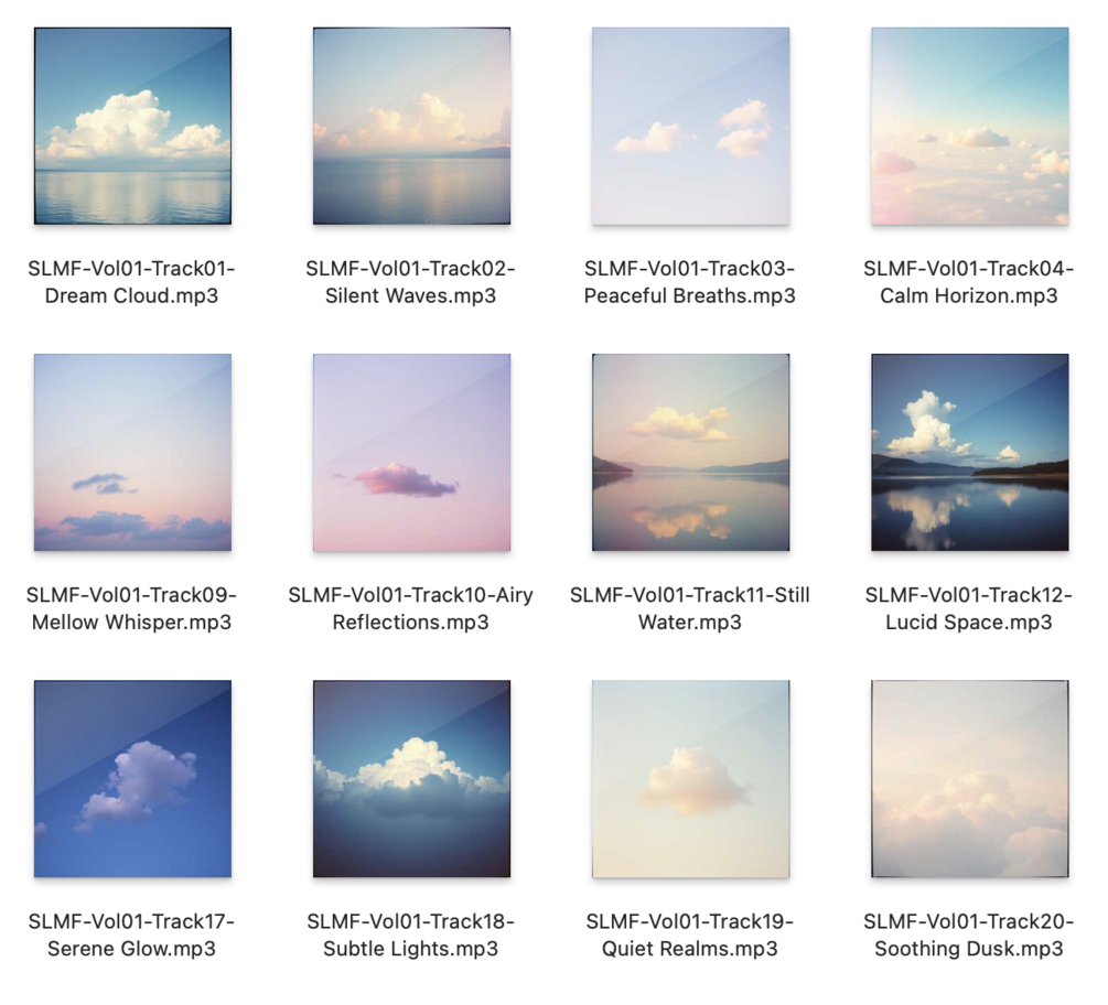• Every track with a unique, curated title (e.g. Dream Cloud, Silent Waves, Soothing Dusk)