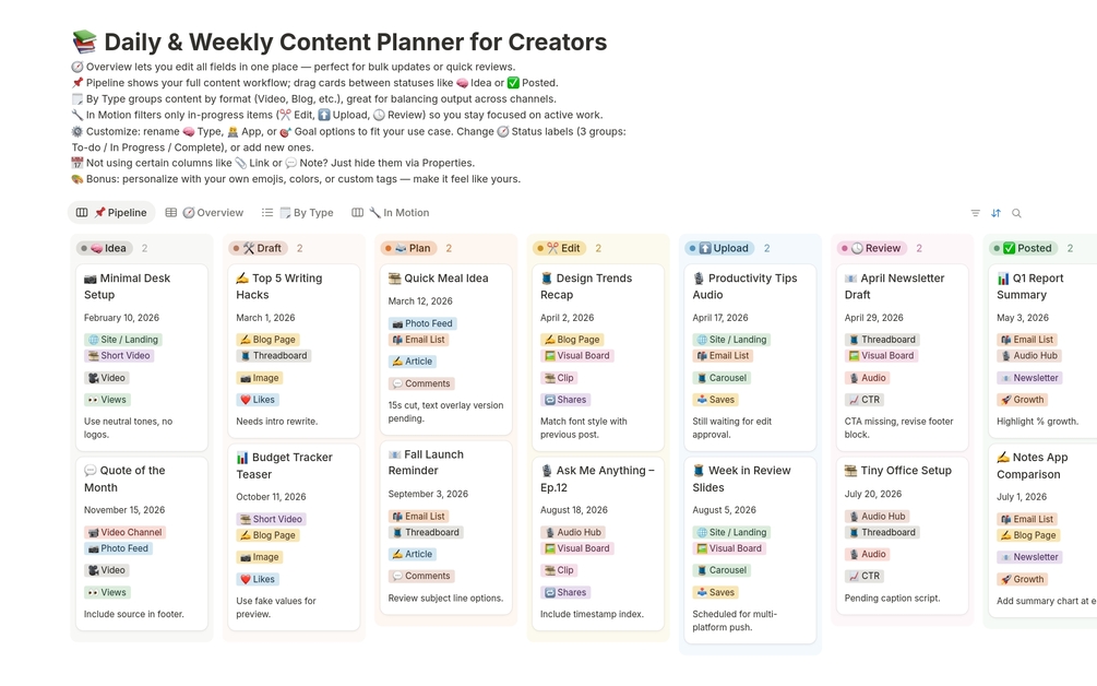 Plan, track, and organize all your content — from idea to published — in one clean, colorful, and fully customizable Notion workspace. Designed for solo creators who want structure, clarity, and creative flow across every platform.