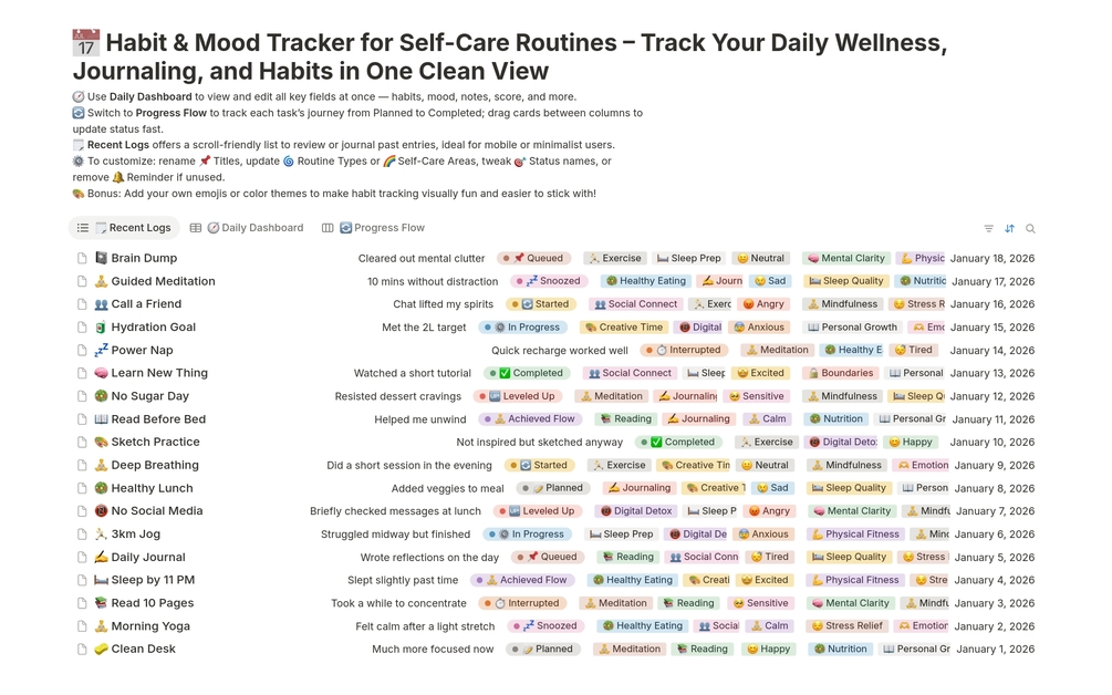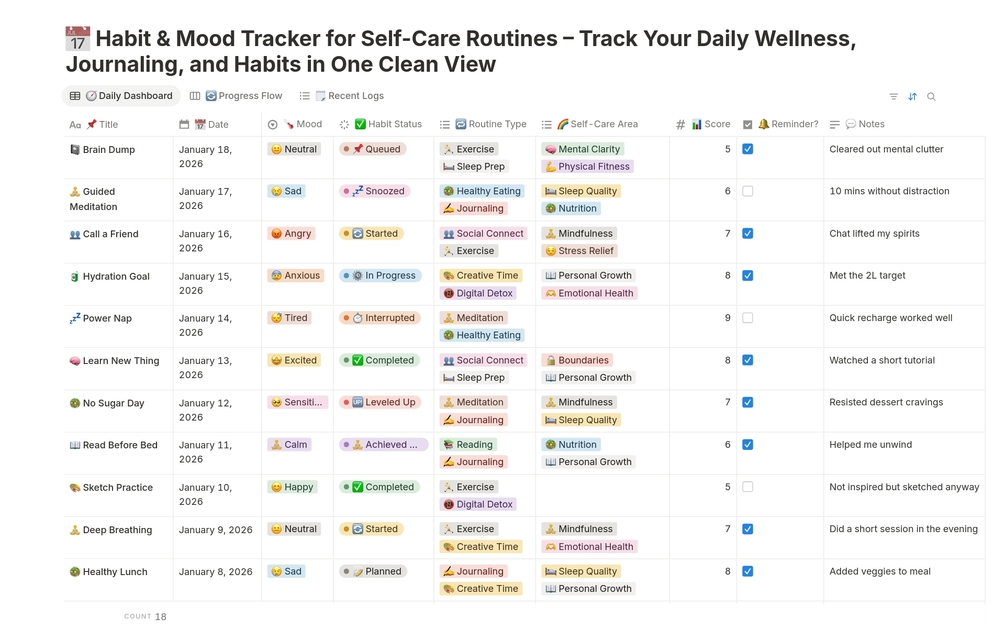 ✅ Columns: Title, Date, Status, Mood, Routine Type, Self-Care Area, Notes, Score, Reminder
