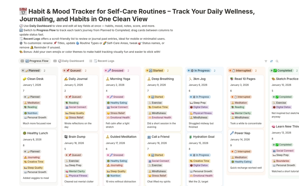 Track your habits, reflect on your mood, and stay consistent with daily routines — all in one colorful and fully customizable Notion dashboard. Built for mindful creators and everyday achievers who want clarity, balance, and a calm rhythm to their day.